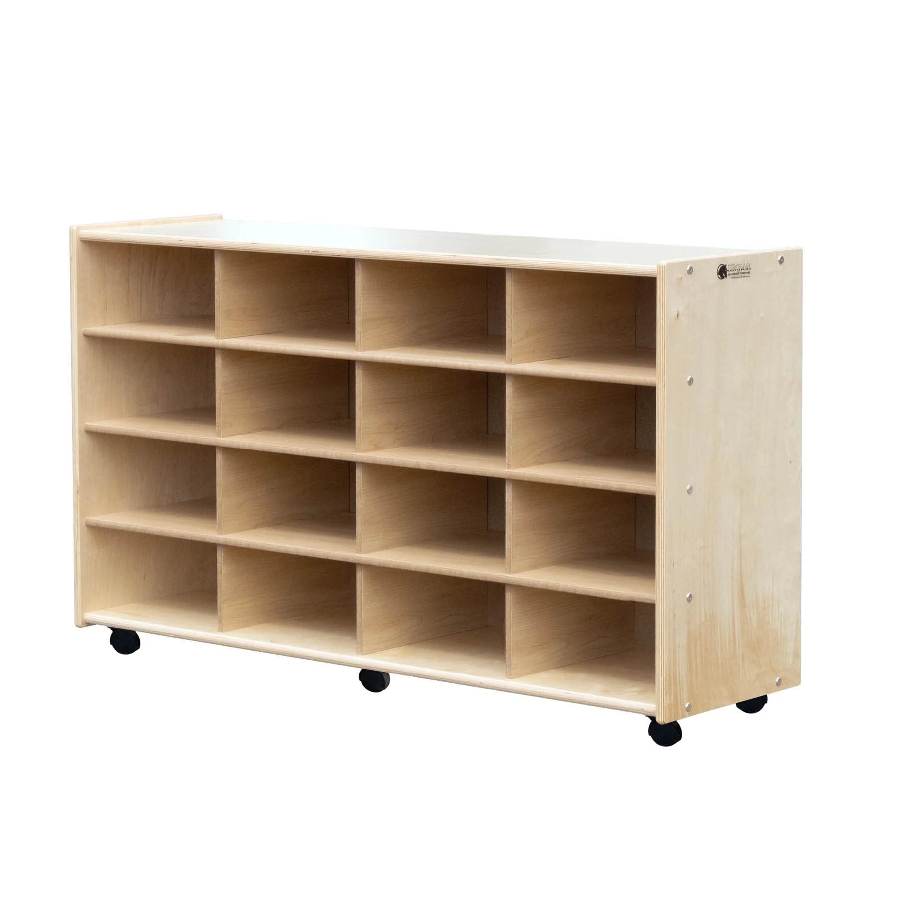 Holds up to 16 large bins – sold separately. Moves easily from room to room on non-marking, 2" lockable casters (included). Durable Baltic birch construction is finished with a UV resistant coating and is covered by limited, lifetime warranty. It’s easy to clean and rounded corners help keep children safe. Ships fully assembled. Measures 53"L x 16"W x 32"H