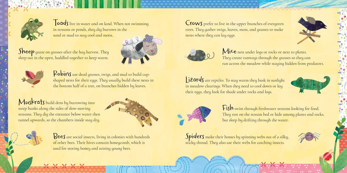 - Further learning with two full pages of endmatter dives deeper into the different types of creatures found in a meadow