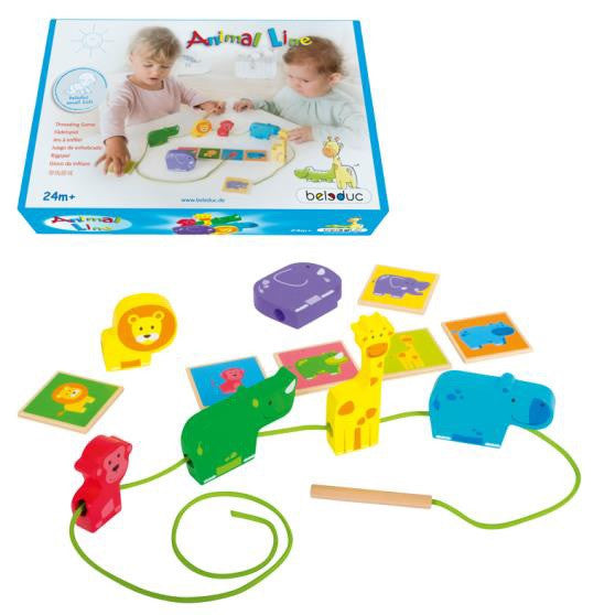 Threading like an adult. With this funny threading game children train assignment and fine motor skills along the way. Small kids just enjoy threading the cute animals, older kids can thread the animals in the order the cards show, which also promotes their memory. Contains 14 pieces. Number of Players 1 or more. Ages 24 months and up.