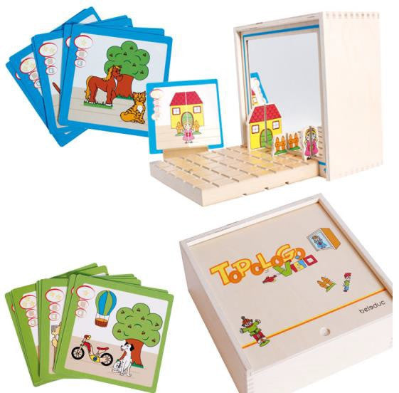 "Next to", "behind" or "in front" " with ToPoLo-Go "Visio" two-dimensional images can be copied three-dimensionally, and spatial positions can be understood easily. The cards are assigned to three levels of diffi culty and show sceneries and figures in different positions, which need to be copied on the grid board - depending on the alternative to play with or without the magnetic or the mirror board. Spatial sense and imagination are trained in particular. Ages 4 and up.