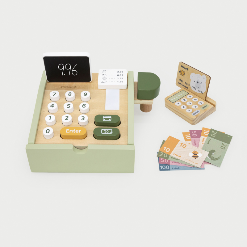 Just like a real-life register! The main unit has a pull-out drawer, blackboard screen, receipt block and scanner holder. The accessories included are a scanner, a credit card reader, receipt roll, a credit card, 14 coins and 8 bank notes stored in the drawer. Perfect early educational toy to introduce the concept of buying and selling, and to help encourage imaginative play and social skills. A good accessory for any market stall or play kitchen. Includes register with 4 removeable parts and 25 accessories. Ages 3 and up.