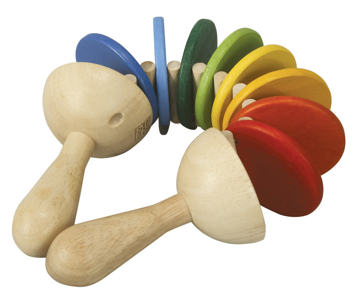 Move the handles up and down to hear the clatter sound. Measures 5.5"x7.5"x2.5" Ages 19 months and up.