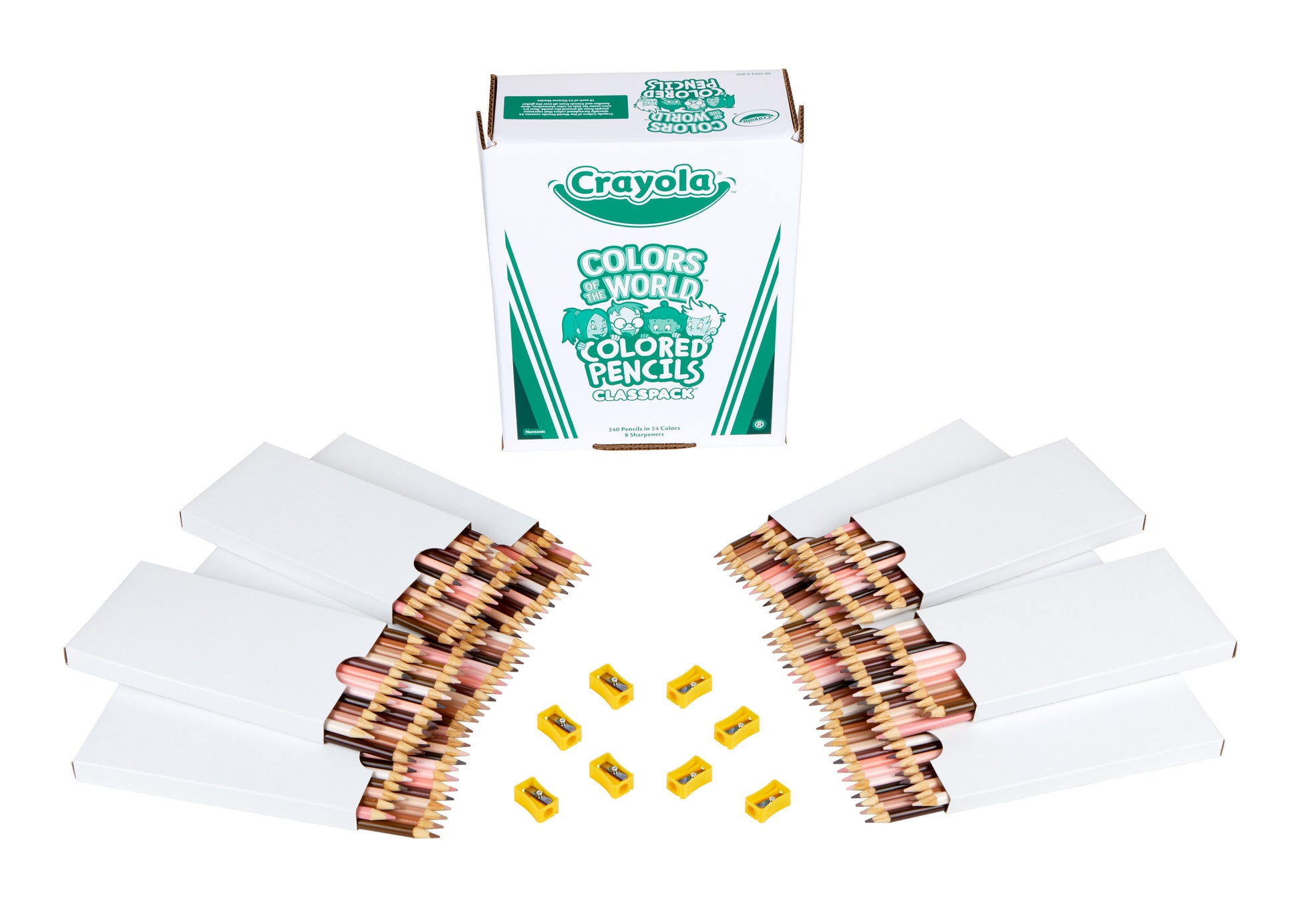 Contains 240 coloured pencils in 10 sets of 24 colours and 8 pencil sharpeners. Includes 24 new coloured pencil colours that represent people of many different regions and cultures.