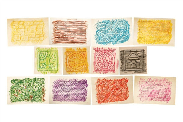 We've combined stencils and rubbing plates to give you the ultimate collage castle experience. Use the set of 10 rubbing plates to add vines that grow from the rocky ground, up the block walls, past the stained-glass windows, all the way up to the shingles at the top! Includes: 27 stencils, up to 4" x 8.25", 10 rubbing plates, 6" x 8.5", 12 designs and reference guide. Age 3 and up.