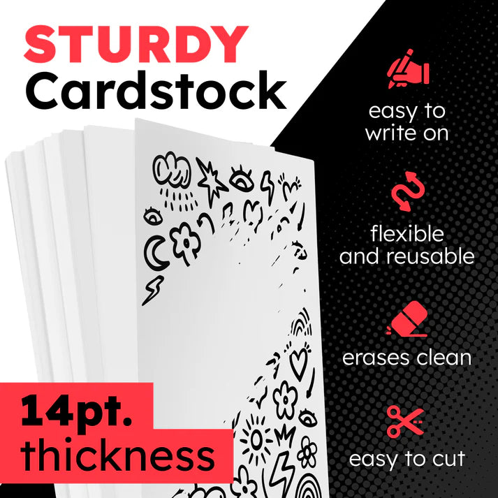 Elevate your workspace with these innovative white board dry erase poster boards! Lightweight and easy to store, yet durable and reusable. One side dry-erase surface, plain cardstock on reverse.