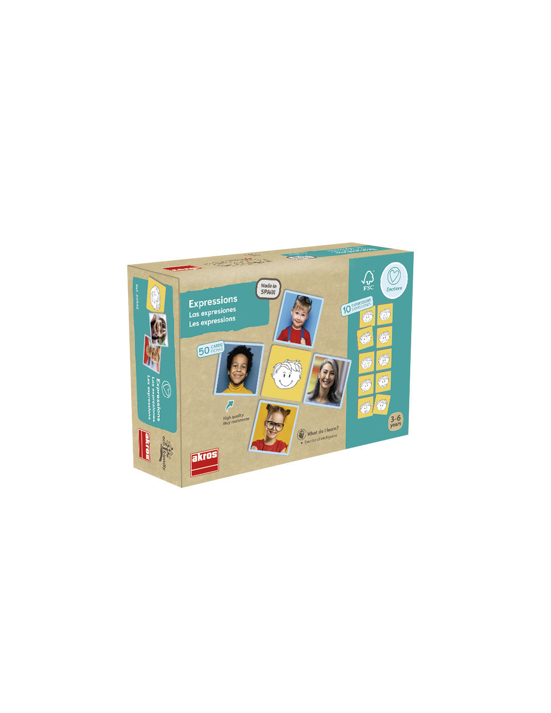 A game for learning to identify facial expressions from icons and associating them with photos of real expressions. Includes 50 cards (9 x 9 cm). Ages 3-6.