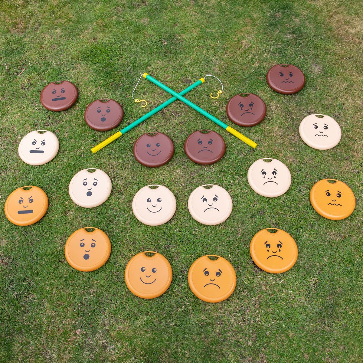 Let's talk! This set encourages children to have conversations around emotions. Children hook the discs with their fishing rods and identify the emotion they have picked! Giant Emotions Fishing will improve motor skills, develop hand-eye co-ordination skills and encourage collaborative play. Includes 3 of each expression (happy, sad, angry, upset, worried and surprised) in 3 skin tones. The 18 discs are made from durable HDPE and are approximately 7.8"L and the fishing rods are 28"L. Contains 18 discs, 2 fishing rods, and a mesh storage bag. Ages 2 and up.