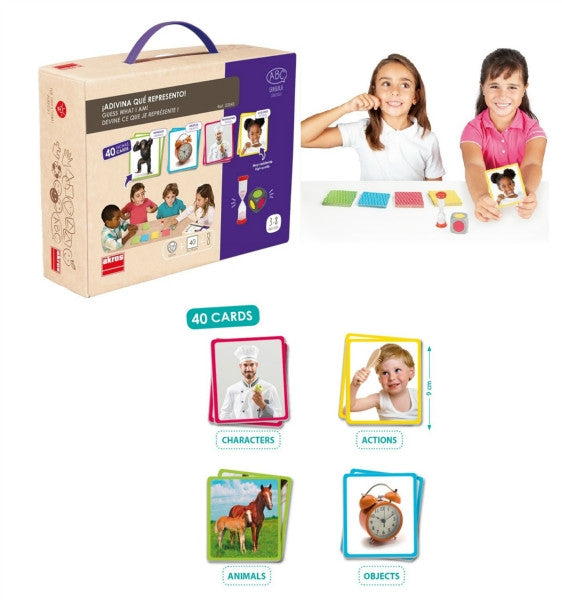 Throw the dice and pick up the corresponding colour card. Don't show it to anyone, turn over the hourglass and start acting. Whoever manages to guess what youre representing before the time runs out gets to keep the card. The winner is the person with the most cards. Includes 40 cards (9 x 7,9 cm ), 1 maxi-dice (3,5 cm edge), 1 hourglass. Ages 3-8.