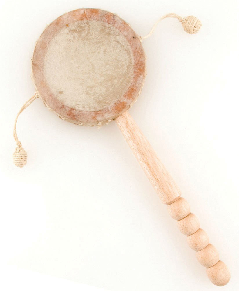 Based on a traditional Chinese instrument, the Den Den drum is perfect for a musical classroom, or any child interested in creating rhythm in a new way. This beautiful version of the Chinese den den drum features a natural wood handle and frame. The goat skin head and beaters are uniquely woven with natural cord. Ages 3 and up.