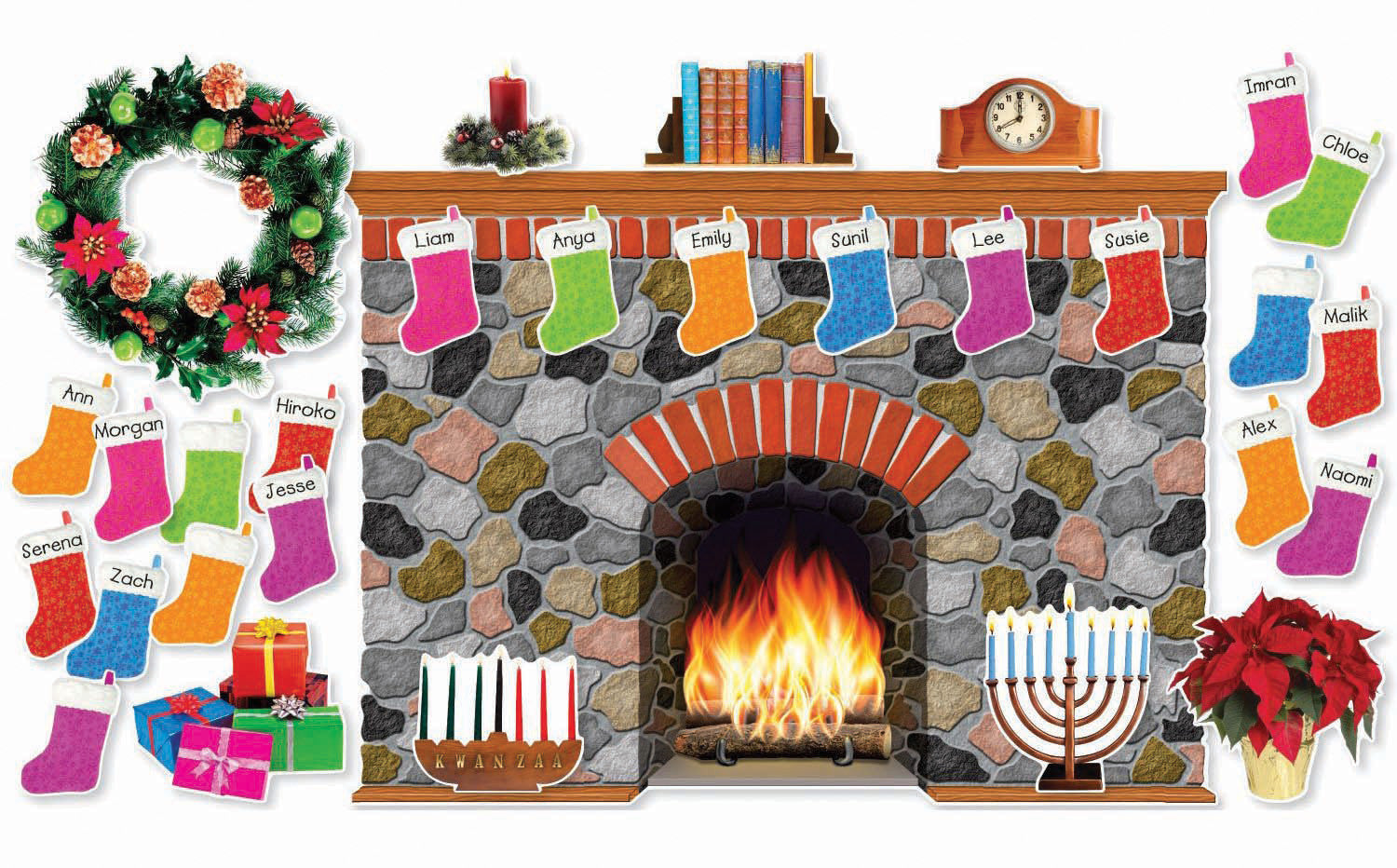 Includes 45 pieces: 1 large hearth (38" x 27"), 8 photo accents (wreath, poinsettia, books, clock, menorah, kinara, gifts, and candle), 36 ready-to-personalize holiday stockings and activity guide.