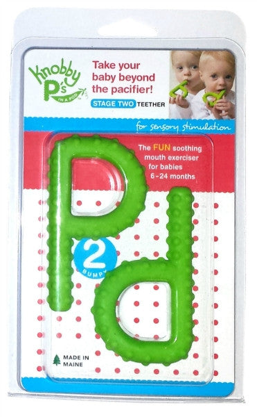 Each textured letter offers a flexible and bumpy surface, perfect for new teeth getting ready to start chewing foods. This stage 2 teether covered with knobs adds just the right amount of sensory input to the teething experience, making it ideal for practicing biting and chewing skills. Teething on the Knobby letter allows Baby's mouth to remain open for breathing and sound play! Knobby letters are free of latex, lead, BPA, PVC and phthalates. Knobby letters are approximately 3" in diameter and 1/2" thick. 6-24 months.