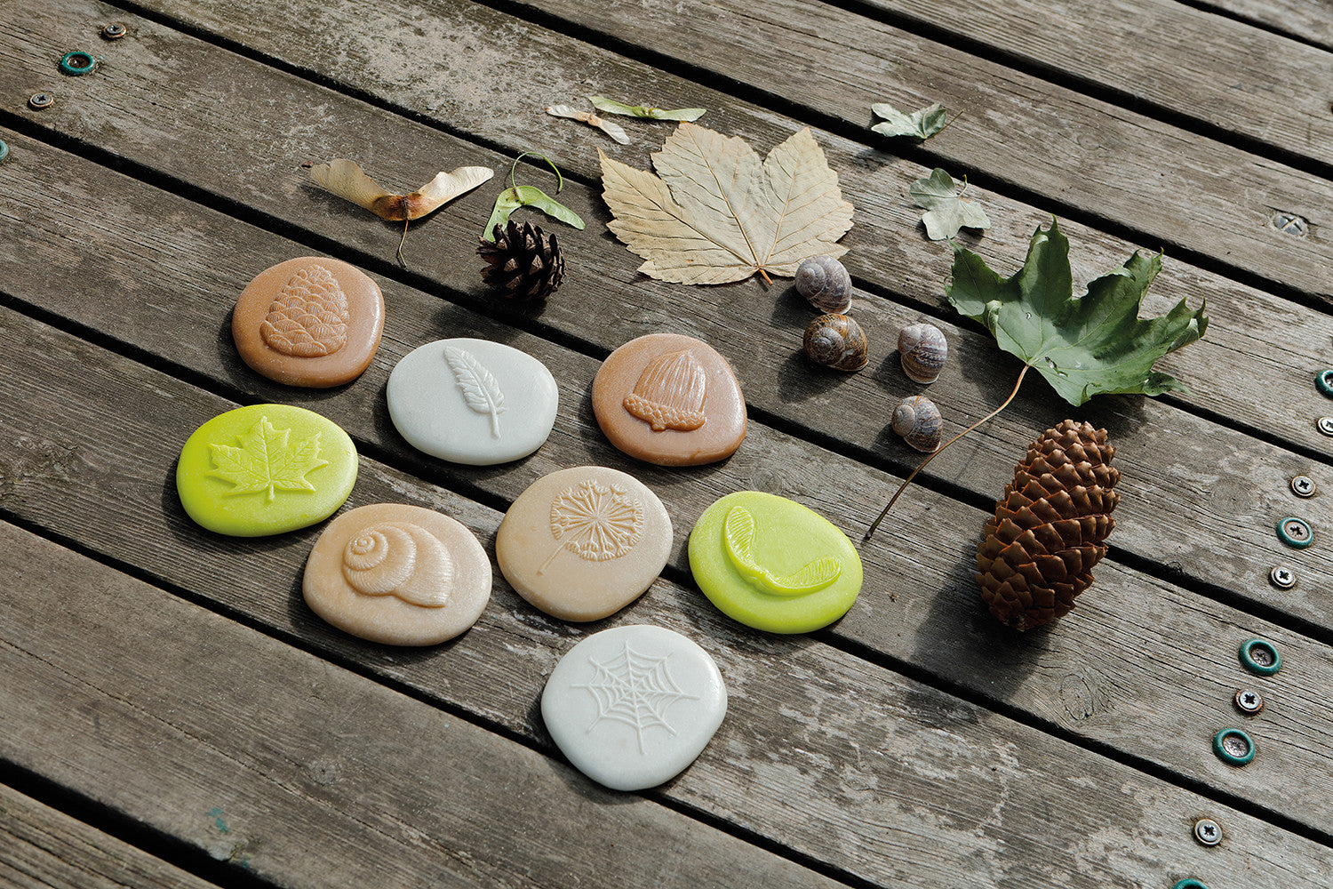 These beautifully tactile stones reflect the natural treasures children might discover in the natural world. Designed for outdoor learning, investigative play and forest school, the stones are robust for lots of outside adventures! They are durable enough to be used in water, soil, mud and play clay, and are easily cleaned. Wonderfully sensory, the details on the stones can be felt as well as seen. Go on a nature hunt and compare with the real things, make imprints in play dough and take rubbings using wax crayons. Children will delight in such activities, learning about nature at the same time.Set contains eight stones: acorn, dandelion seedhead, feather, pine cone, snail shell, spider’s web, sycamore leaf, sycamore seeds. Stones measure approximately 80mm. Safe for ages 2 and up.