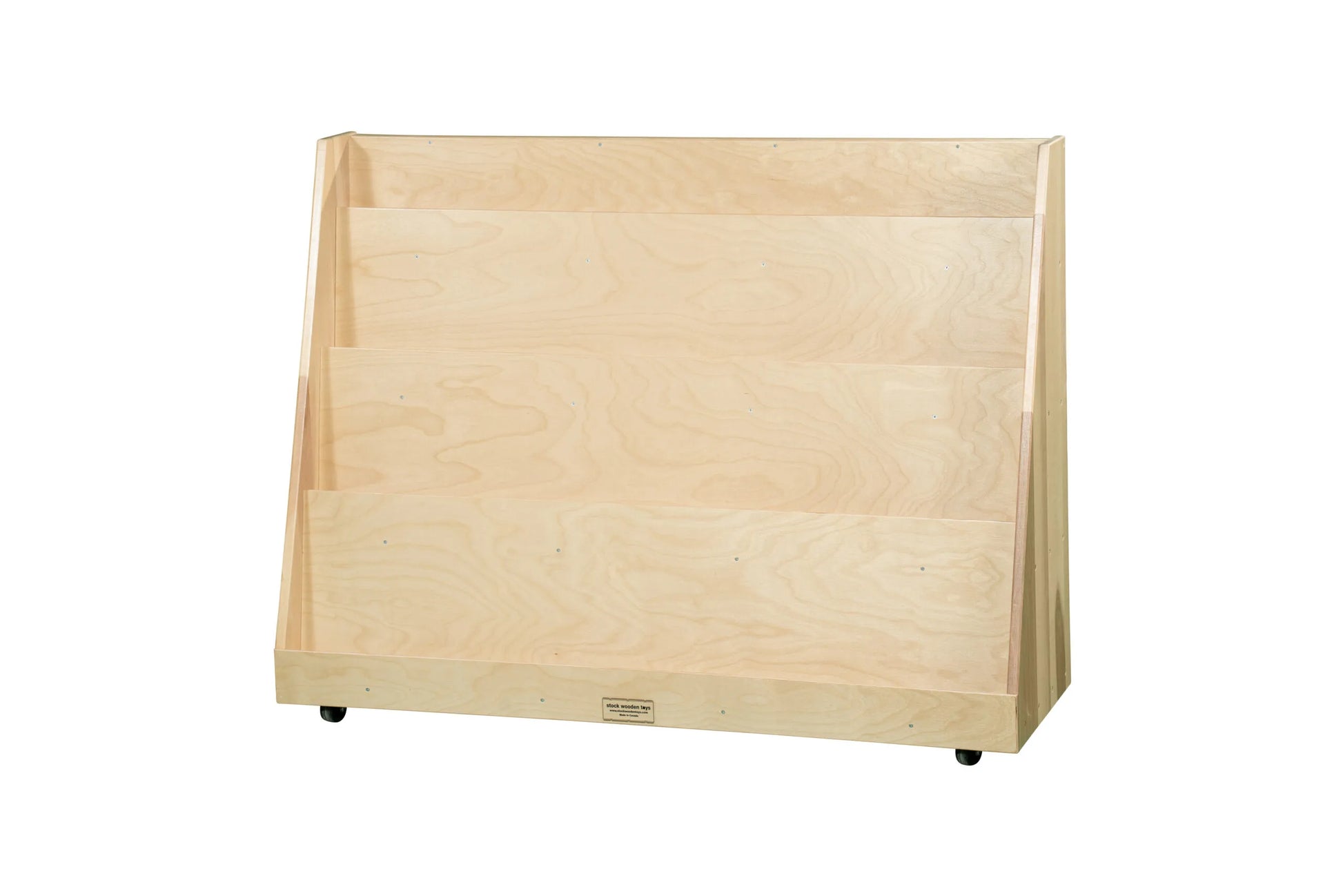 Double sided Library has four shelves on one side and a slanted book display with deep pockets on the other. With casters. 48"L?×?38"H?×?15"D.