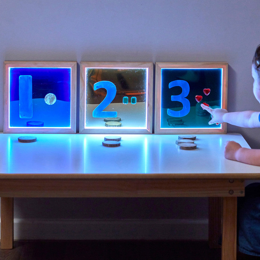 Illuminate a space with three light up acrylic mirrors that enhance sensory play and emotional growth. Note that each mirror requires three AA batteries, which are not included. Each measures 9.8”L x 9.8”W x 9.8”H. Ages 3 and up. Accessories are not included. Assembly required.