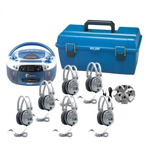 Includes: One AudioStar CD/USB/Cassette/Radio boombox with built-in tape and CD-to-MP3 converter. Six SC-7V Deluxe Headphones. One eight Position jack box with volume control. One large, lockable carrying case (lock not included).