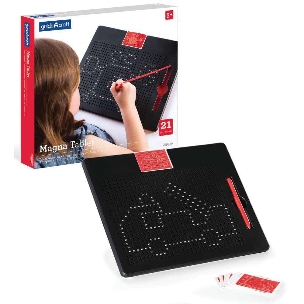 Children produce satisfying clicks as they drag the magnetic pen across the grid surface of the Magna Tablet to create shapes geometric shapes, animals, letters, vehicles and more. A powerful magnetic pen tip attracts encased metal ball to the small holes on the surface of the grid. Encourage children to recreate patterns from the design cards or design their own drawings. Design Cards with suggested patterns included. Dimensions: 12"L x 10"W x .5"H. Ages 3+.