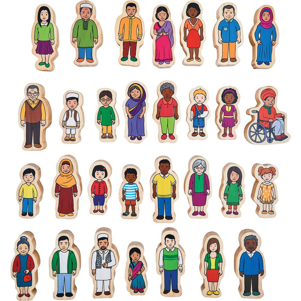 Great for role-playing and storytelling, the Village Families set represents the diverse, multicultural families that make up our local communities. This colorful set comprises 30 high-quality, 2cm thick wooden figures that are screen-printed for durability on both sides. A range of ages, ethnic backgrounds and genders are represented. The figures vary in height from 6 to 8cm, and the set is suitable for age 1+.