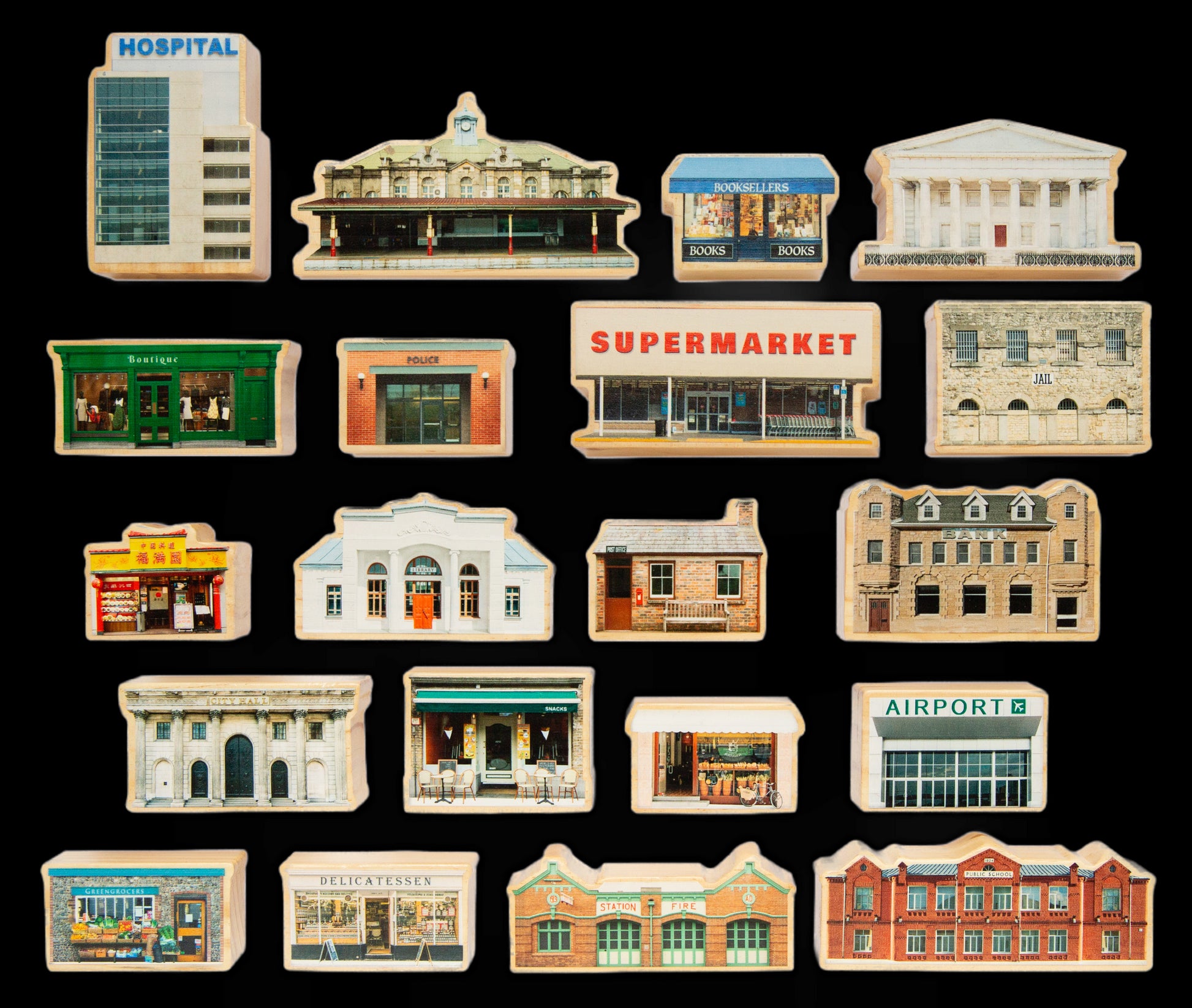 Discover different buildings all around the town with the My Little Town wooden block set! This 20-piece wooden block set is made of smooth New Zealand Pine. It features real, double-sided images of 20 different buildings found in towns. The images include a bakery, hospital, supermarket and more! An open-ended activity for imaginative play and creative storytelling, these blocks feature a stunning, all-natural wooden feel. Each block features a real image, which is heat transfer printed with safe, eco-friendly paint. The pieces are coated with non-toxic lacquer. Pieces measure 4.3"H x 3"W - 2.2"H - 2.8"W. All blocks measure 0.8" diameter. Ages 1 and up.