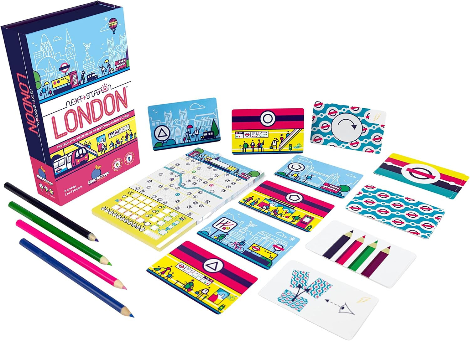 Design the tube network of your dreams with Next Station London! Strategise connections, serve landmarks and try your hand at tunneling under the Thames. Show the city you can meet its exacting specifications, and be crowned the king (or queen) of project managers. Spiehl des Jahres nominated - you don't want to miss this one! Contents: 1 pad of 100 sheets, 4 colored pencils, 20 cards. 1-4 players. Ages 8 and up.