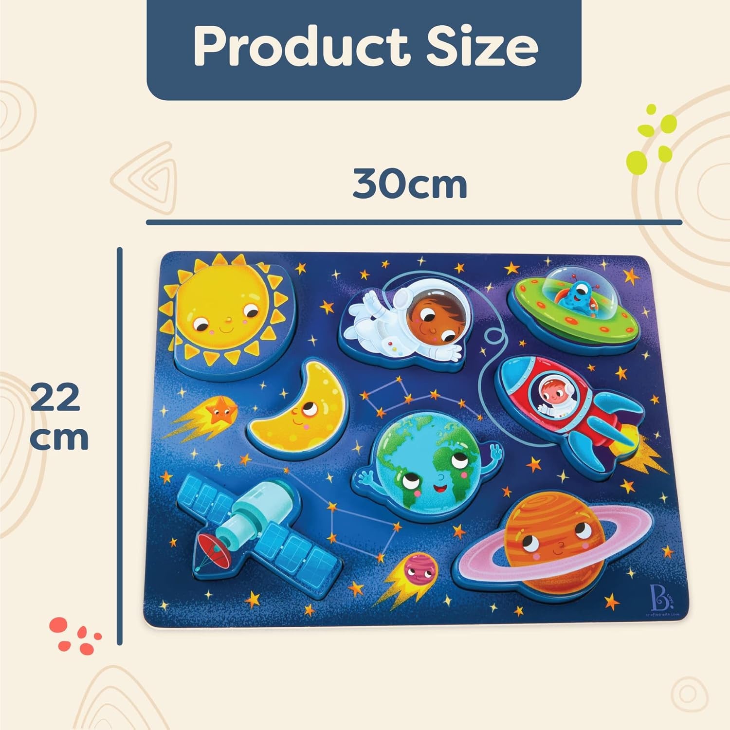 Play among planets and stars with a chunky ‘n’ colourful puzzle! 8 Pieces: This puzzle comes with a wooden board and 8 pieces – 2 planets, 1 sun, 1 moon, 1 alien spaceship, 1 rocket ship, 1 astronaut, and 1 satellite. Ages 2 and up.