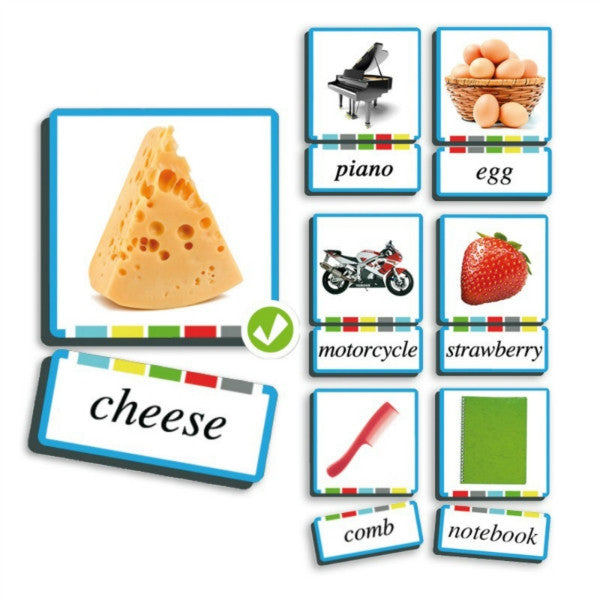 A game of association for matching 108 verbs/nouns with their corresponding images. Includes 108 cards each with images (7 cm x 7 cm), 108 cards with verbs/nouns (7 cm x 3 cm).