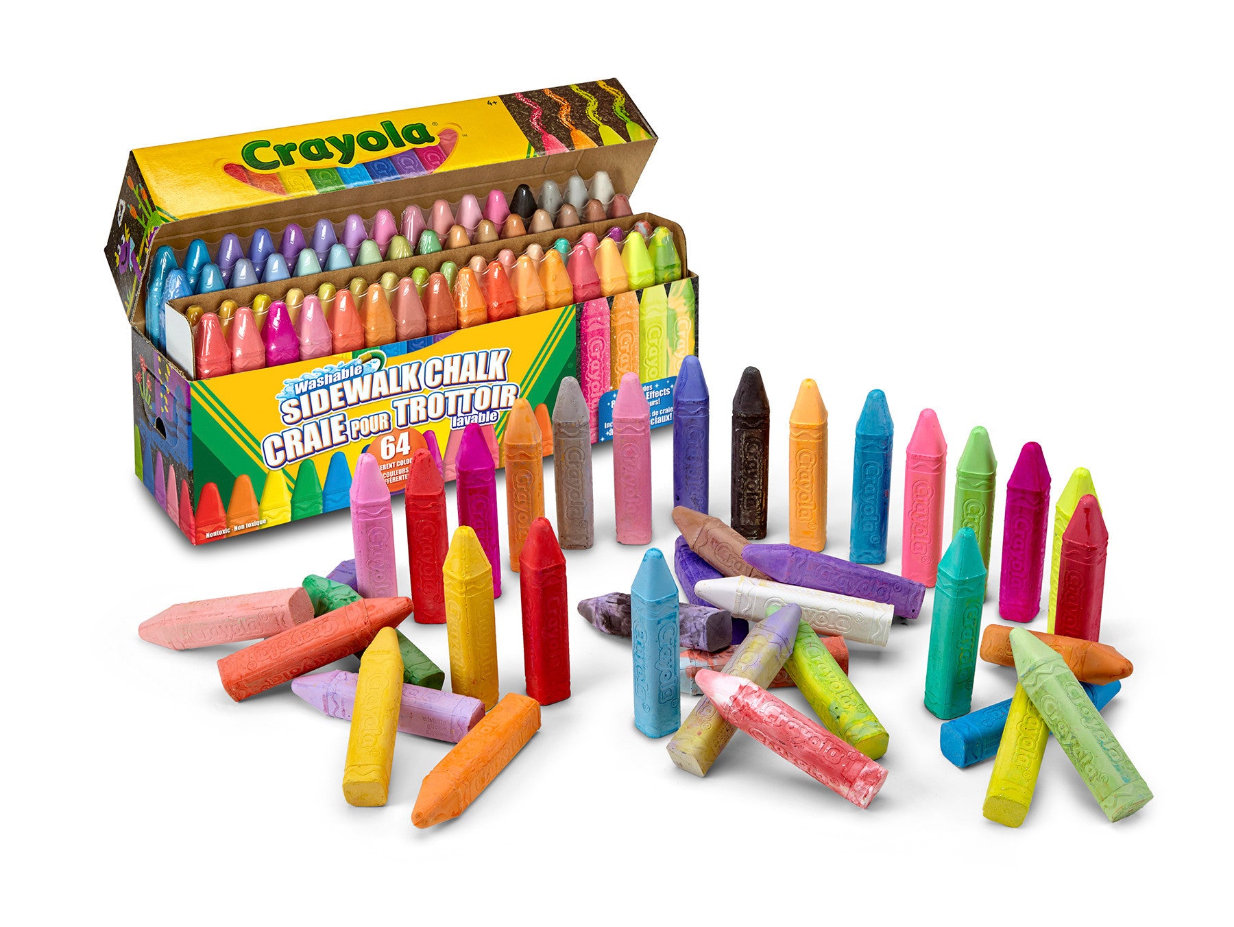Includes 64 washable sidewalk chalk sticks. Anti-roll shape prevents the chalk from rolling down inclined surfaces. Includes 8 special effects chalk colours. Washable, sprays away with water.