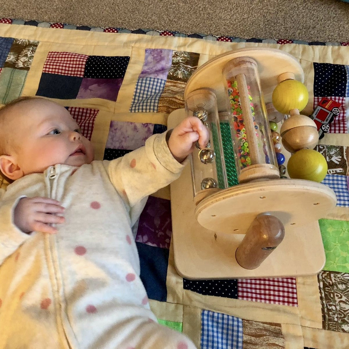 Features four individual tubes that each hold a different visually engaging material, as well as featuring a set of clacking wooden spheres. The entire drum spins with the slightest effort and the individual tubes also spin. Made from sustainably-sourced wood. Measures 10.25" x 8.5”. All ages.