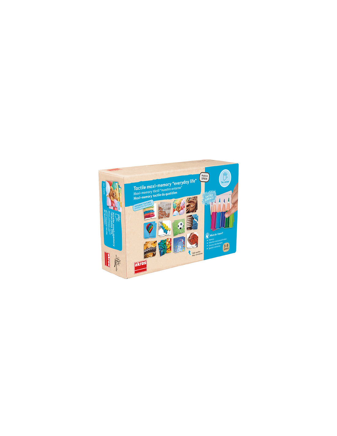 A large-format tactile memory game with different textures featuring real images of everyday life. The game consists of 34 cards make of thick, strong cardboard which is hard-wearing and high quality. Each card contains a different texture relating to real-life images of the environment. For working on tactile discrimination, visual memory and attention through the sense of touch. You can play both the classic and tactile memory games. Inspired by the Montessori methodology. Includes 34 tactile cards (9 x 9 cm). Method of Play and Activities: