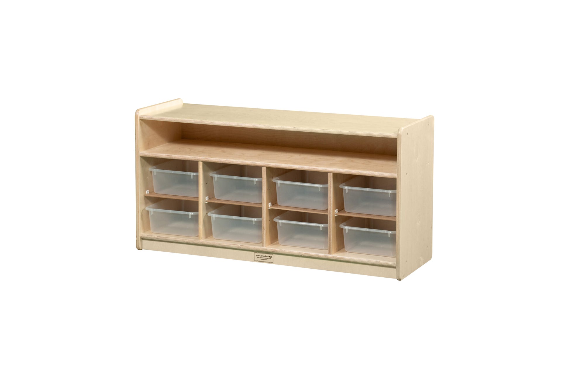 Upper open shelf and 8 semi clear tote trays. 4 removable shelves. 46 1/4" L x 15 5/8" W x 24" H.