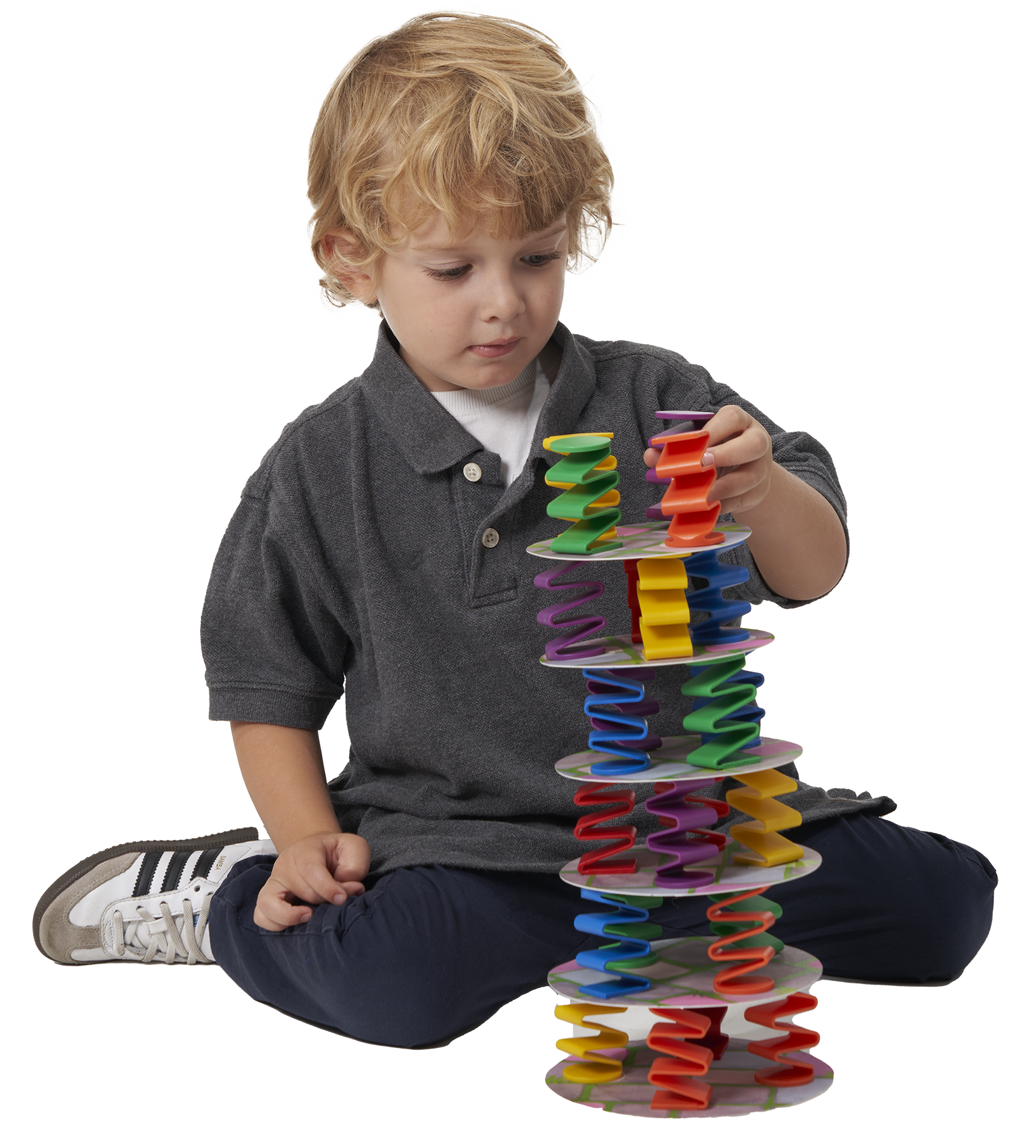 Develop focus and precision! Master each of the four challenge levels or mix the layers to create unique towers. Spring Blocks are ideal for building stable and dynamic structures. Each layer card is printed with shapes that guide children while building. Includes: 24 Spring Blocks that measure 1" x 1.25" x 2.5", and 28 layer cards that measure 6.75" x 6.75" . Ages 4 and up.