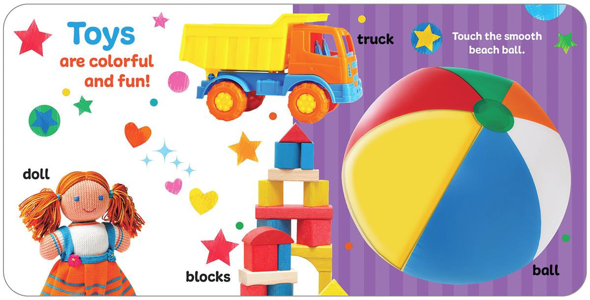 Babies love to explore and touch as they see and hear first words. Photos of real clothes, food, toys, and animals, plus bright illustrations are fun to look at and will keep babies and toddlers engaged. Sensory touches and peek-thru holes make this first words book a favourite with curious little boys and girls. Infant-Toddler. Boardbook.