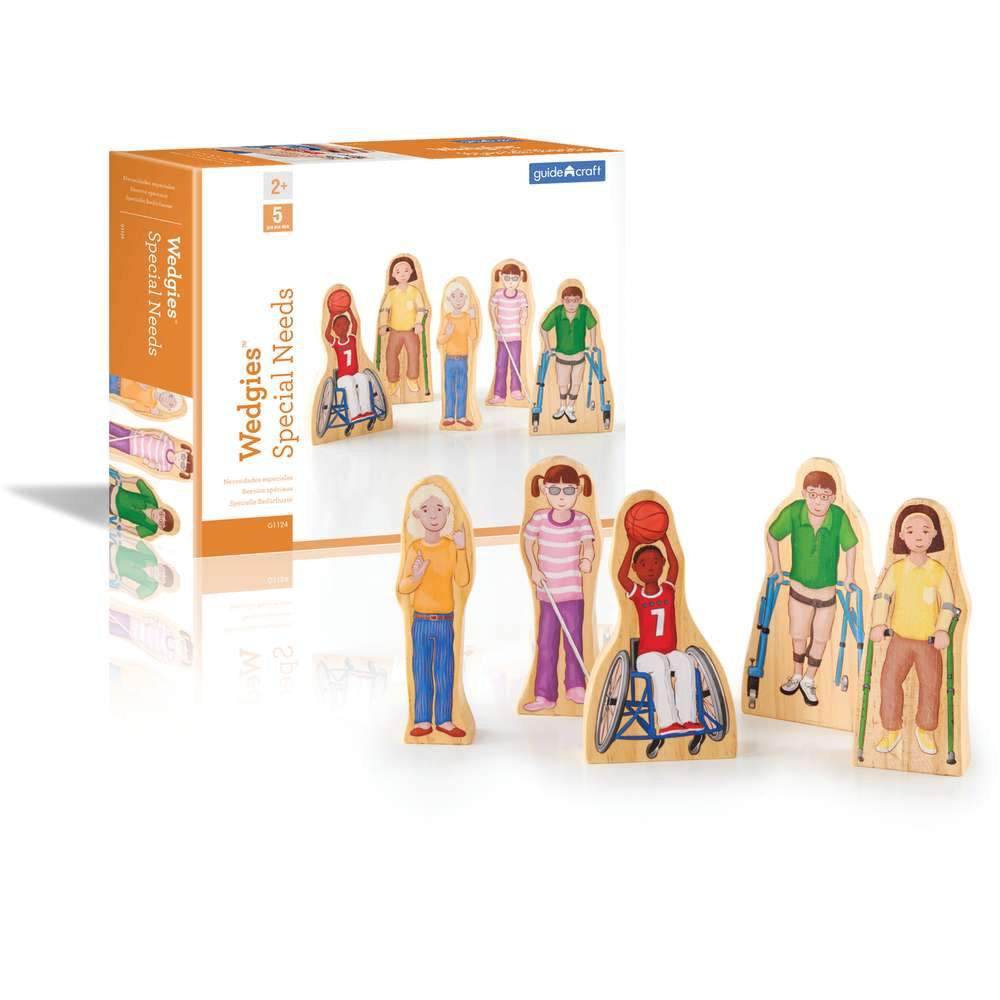 Wedgies, Guidecraft's classic wooden toy, balances both dramatic play and block play with colorful, charismatic characters. Five active children with special needs promote positive awareness. Solid wood, wedged-shaped characters feature double-sided artwork with intricate details and personality, and wide, no-topple bases. 4.5"H figures.