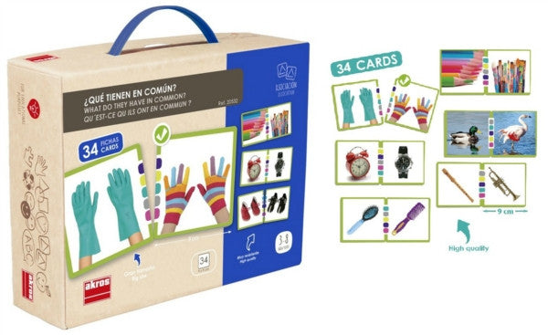 Identify and put together the pairs of objects which share common characteristics. 34 cards (9 x 9 cm). Ages 3-8.