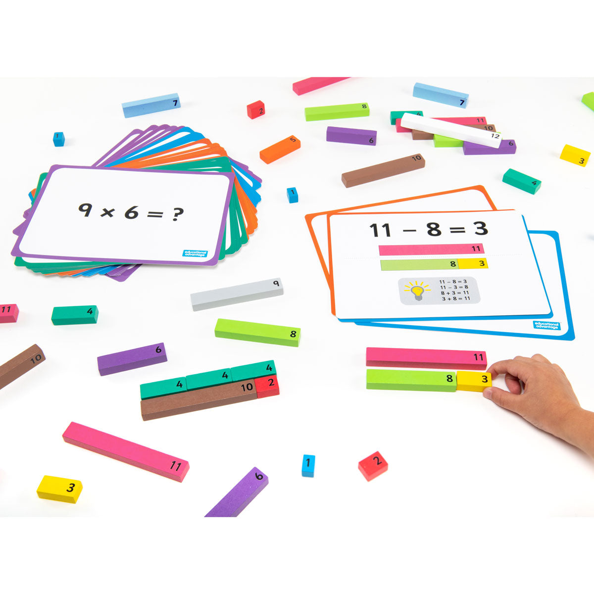 This super set contains 156 rods numbered 1-12 made from sustainably sourced certified wood. Includes 24 'Number 1' rods and 12 each of 'Number 2-12' rods. Each rod measures between 0.39" (1cm) and 4.7" (12cm) long (numbers 1 to 12). 40 comprehensive work cards included (addition, subtraction, multiplication, and division). Each rod is colour coded to represent a number. The rods can also be used in measuring exercises. Easy to clean- A dry or slightly damp cloth with mild soap or detergent, then wipe dry. Ages 3 and up.